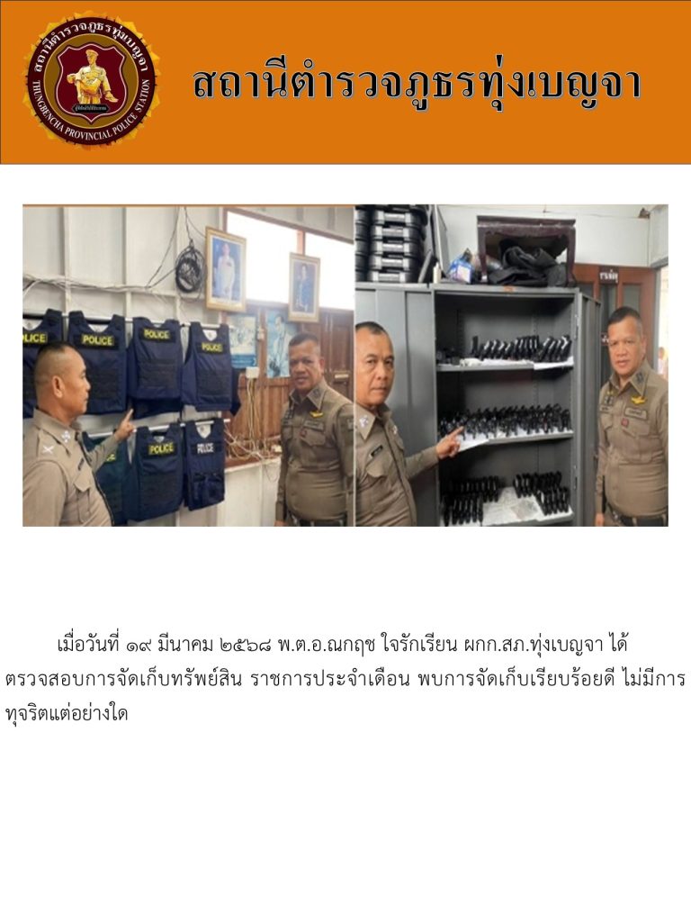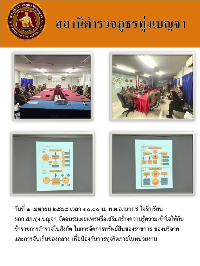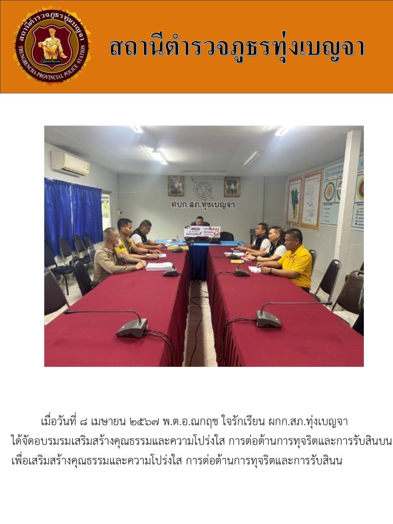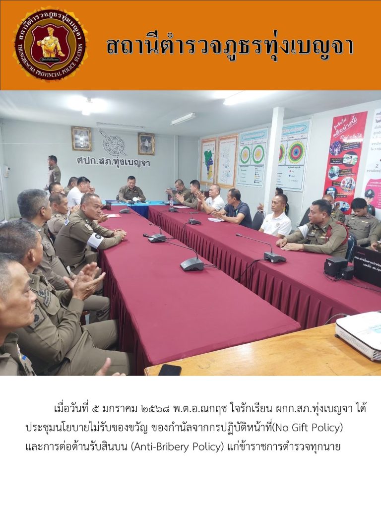 พ.ต.อ.ณกฤช ใจรักเรียน ผกก.สภ.ทุ่งเบญจา ประกาศเจตนารมณ์ของหน่วยงาน ประกาศเจตนารมณ์ ในการป้องกันการต่อต้านการทุจริตของสถานี และประกาศเจตนารมณ์ไม่รับของขวัญ และสินบนอื่นใด ทุกชนิดจากการปฏิบัติหน้าที่ในหน่วยงาน